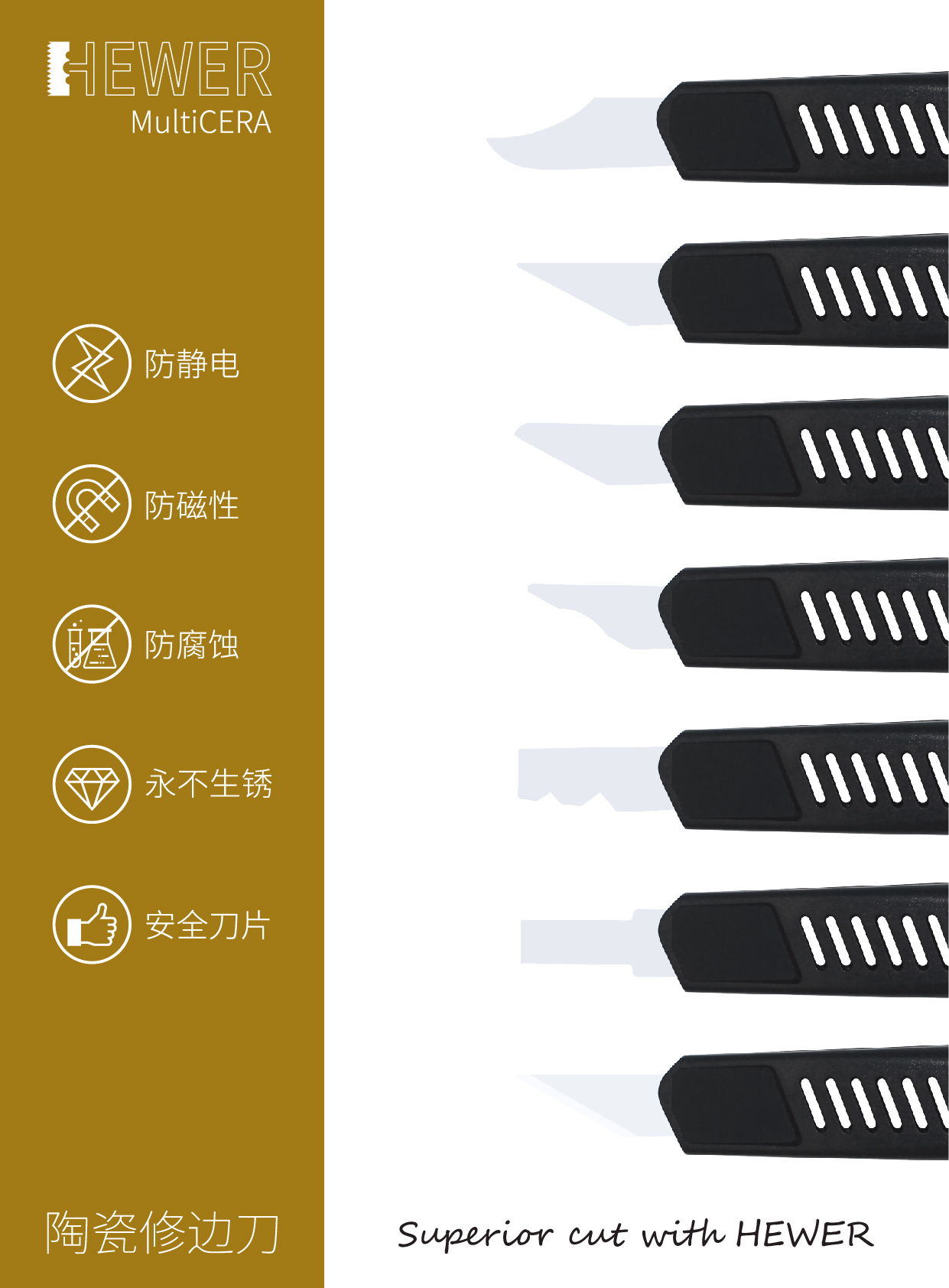 HEWER MultiCERA 安全陶瓷修邊刀可配合多款不同形狀的刀片使用,讓您在不同角度下進行工作。而其刀柄除了采用超耐用的玻璃尼龍材質(zhì),還附有備用刀片庫,可讓您輕易地在多款刀片之間進行切換,方便又好用!HEWER MultiCERA 安全陶瓷修邊刀擁有特別設(shè)計的纖細刀柄,可讓您以各種刁鉆的角度,將刀片伸至許多難以觸及的地方來進行切割作業(yè)。